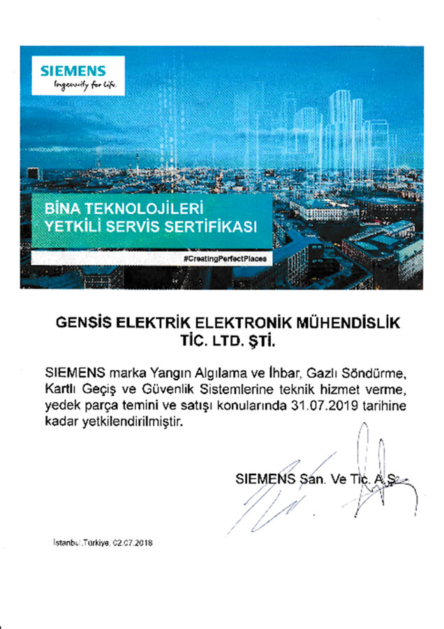 Siemens marka Yangın Algılama ve İhbar, Gazlı Söndürme, Kartlı Geçiş ve Güvenlik Sistemlerine teknik hizmet verme ve yedek parça temin ve satışı konusunda yetkilidir.